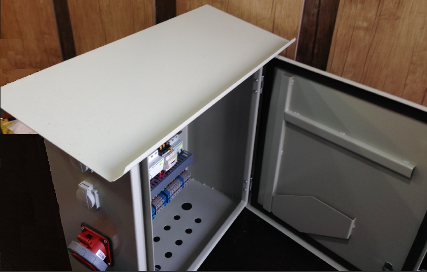 10 عدد تابلو روشنایی به همراه سیستم توزیع برق جانبی و با IP54 و قابل استفاده در محیط بیرون از سالن طراحی و ساخته شده است. این تابلو ها دارای ناودانی بوده بطوری که از پریزهای کناری تابلو نیز در برابر بارش مستقیم باران جلوگیری می کند.